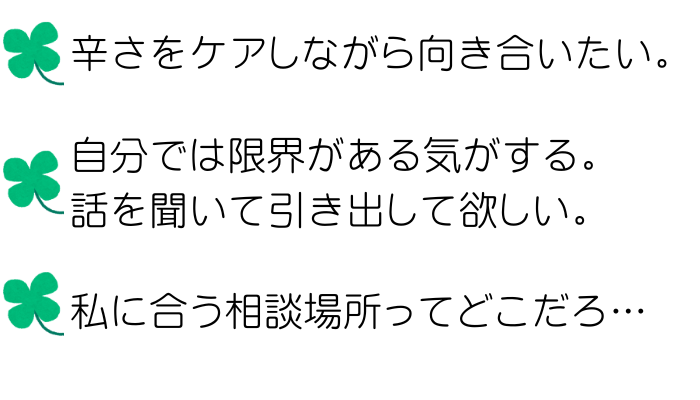 セラピストと二人三脚で内観します。日常生活の中で自分で内観するスキルアップにもなります。会話の内容や過去の振り返りに固定の「型」は使用せず、お一人お一人の心理状況に応じたアプローチで進みます。※医療行為、診断、施術は行いません。